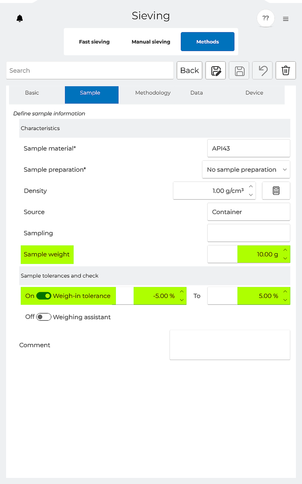 Da der Weighing-Assistant nur mit RETSCH Analysesieben verwendet werden kann, ist er optional in der Methode zuschaltbar.