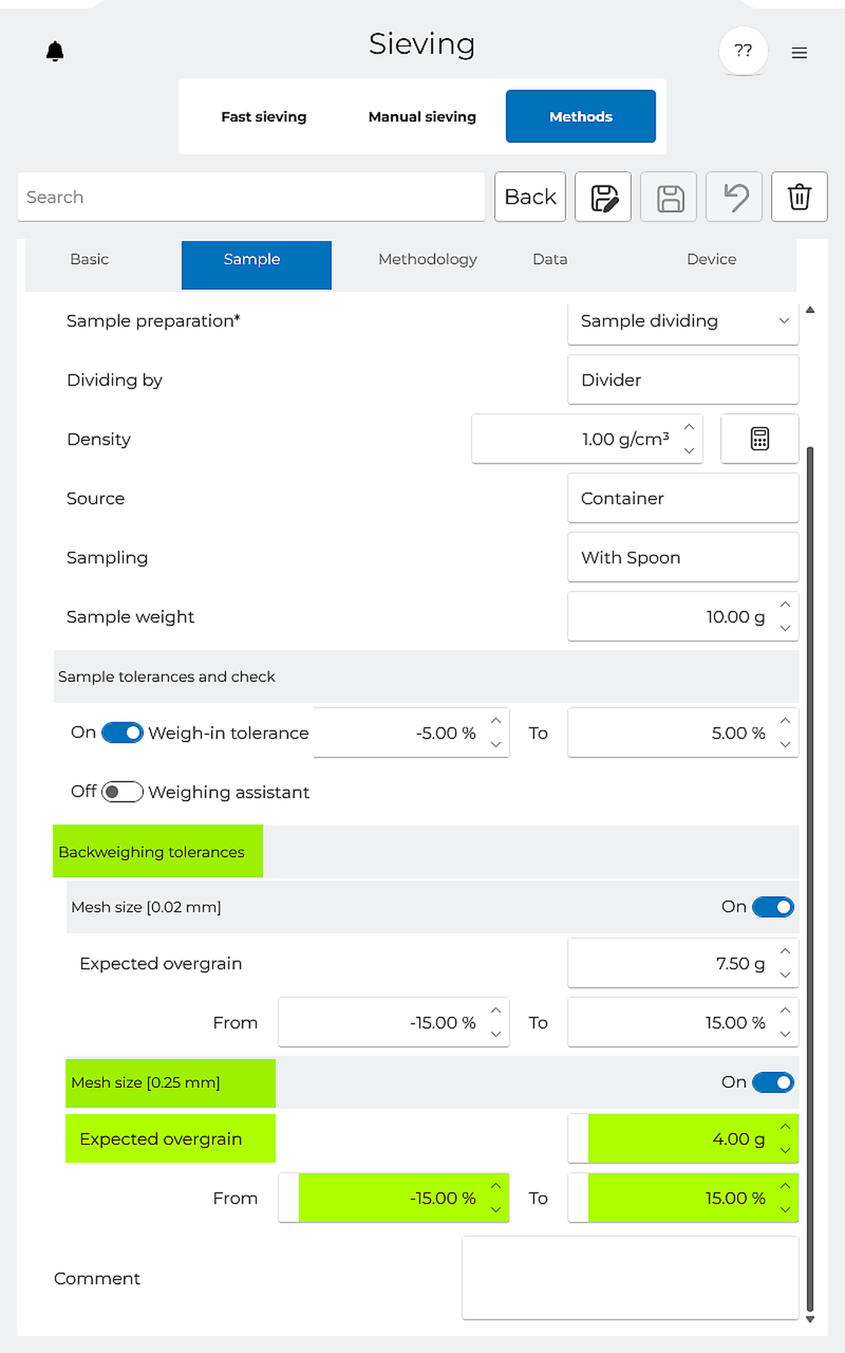 Hält Ihre Probe die voreingestellten Qualitätsgrenzen ein? Mit der Backweigh-Tolerance können Sie sicherstellen, dass Partikelgröße und Partikelgrößenverteilung der Probe Ihre Anforderungen erfüllen.