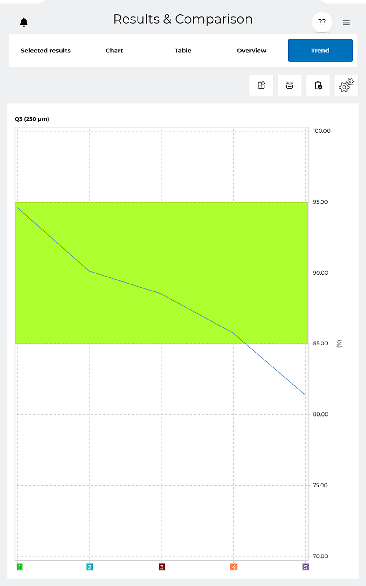Die Trendanalyse kann verwendet werden, um mehrere Siebprozesse anhand frei wählbarer Parameter zu vergleichen. So profitieren Sie von einer einfachen und sicheren Überwachung verschiedener Qualitätskriterien.